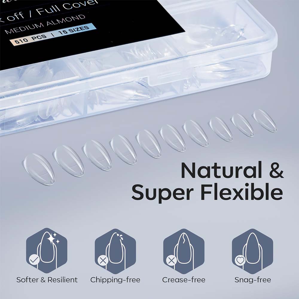 This nail extension set includes 510 medium almond nail tips in 15 different sizes (00–13), with 34 pieces per size. Each tip is individually numbered, making it easy to find the perfect fit for every finger.