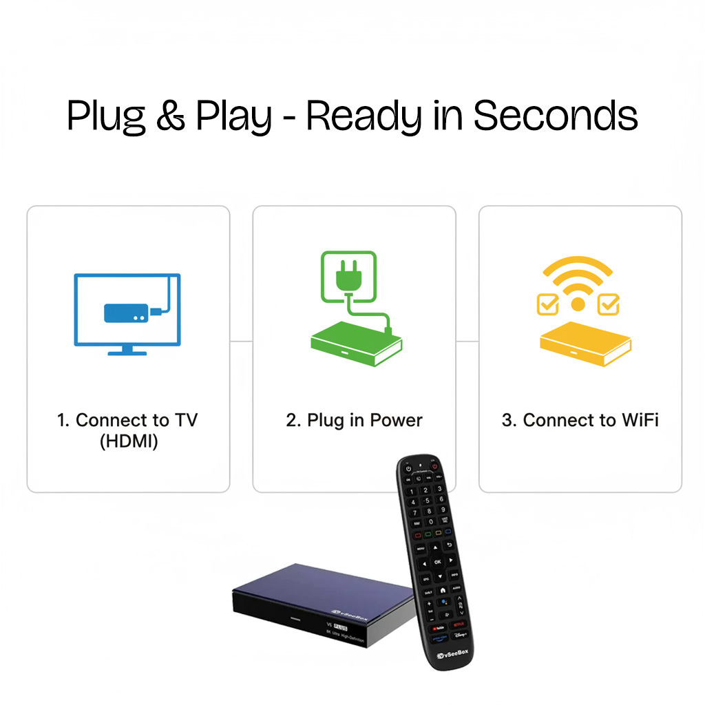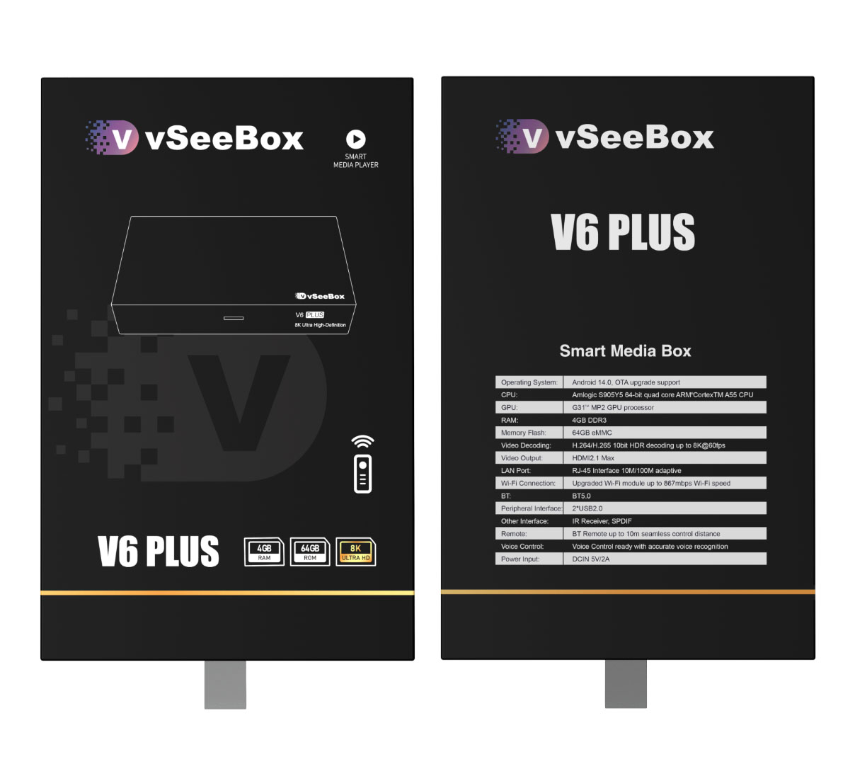 The vSeeBox V6 Plus is a next-generation smart Android TV box designed for high-quality streaming and entertainment. Powered by the advanced Amlogic S905Y5 chipset and running the latest Android 14.0 operating system, it delivers smooth performance, fast multitasking, and support for ultra-high-definition video up to 8K @ 60 fps with 10-bit HDR. With comprehensive connectivity and an ergonomic backlit remote, it’s built to enhance your home viewing experience.